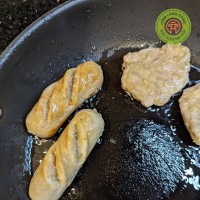 Bước này quan trọng không kém. Nhiều bạn rán lửa to quá, nhiều dầu quá, dễ khiến xúc xích bị xù lên và bị khô. Bạn chỉ cần cho 1 xíu xiu dầu ăn, giống như là chỉ để dính vào mặt chảo thôi ấy.